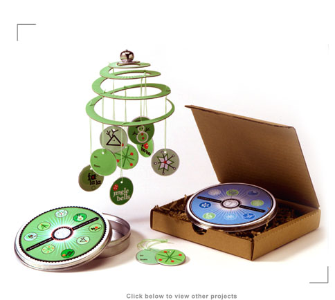 This self promotional holiday greeting is packaged in a metal tin and displays hang tags for use by the recipient.
